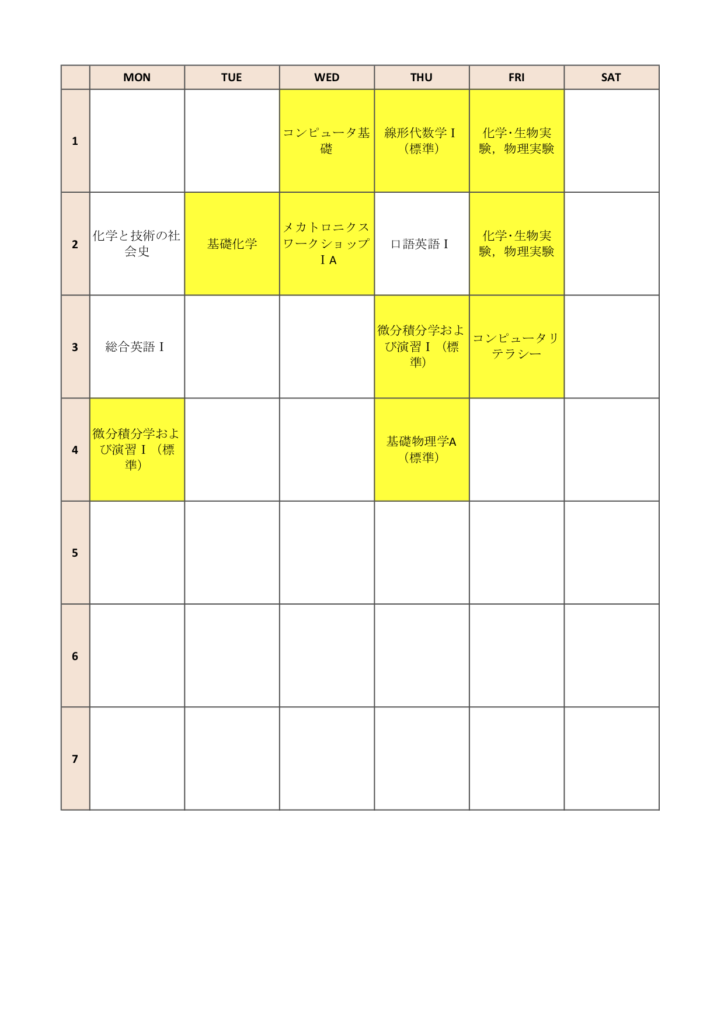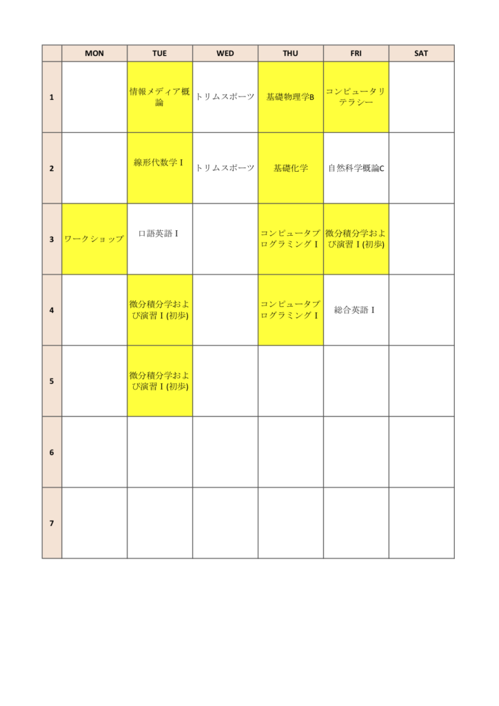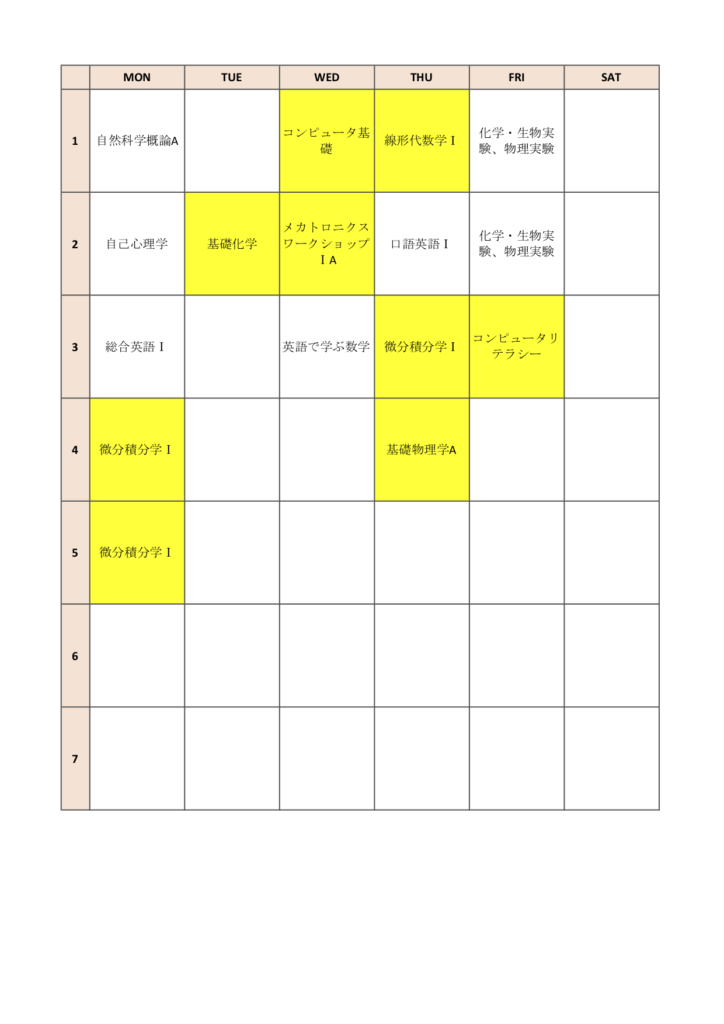 ※ 掲載している時間割表のうち、黄色は必修科目です。